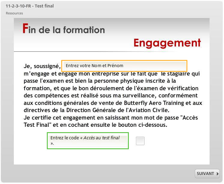 Dans la case accès au test final, il faut renseigner le code d’accès qui a été transmis à votre manager dans le mail d’inscription à la formation et cliquer dans le petit carré.